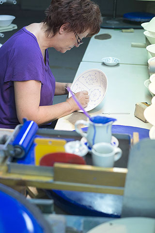 Das Muster wird von Hand gestempelt, einzelne Linien werden handgemalt, in klassichem Kobaltblau